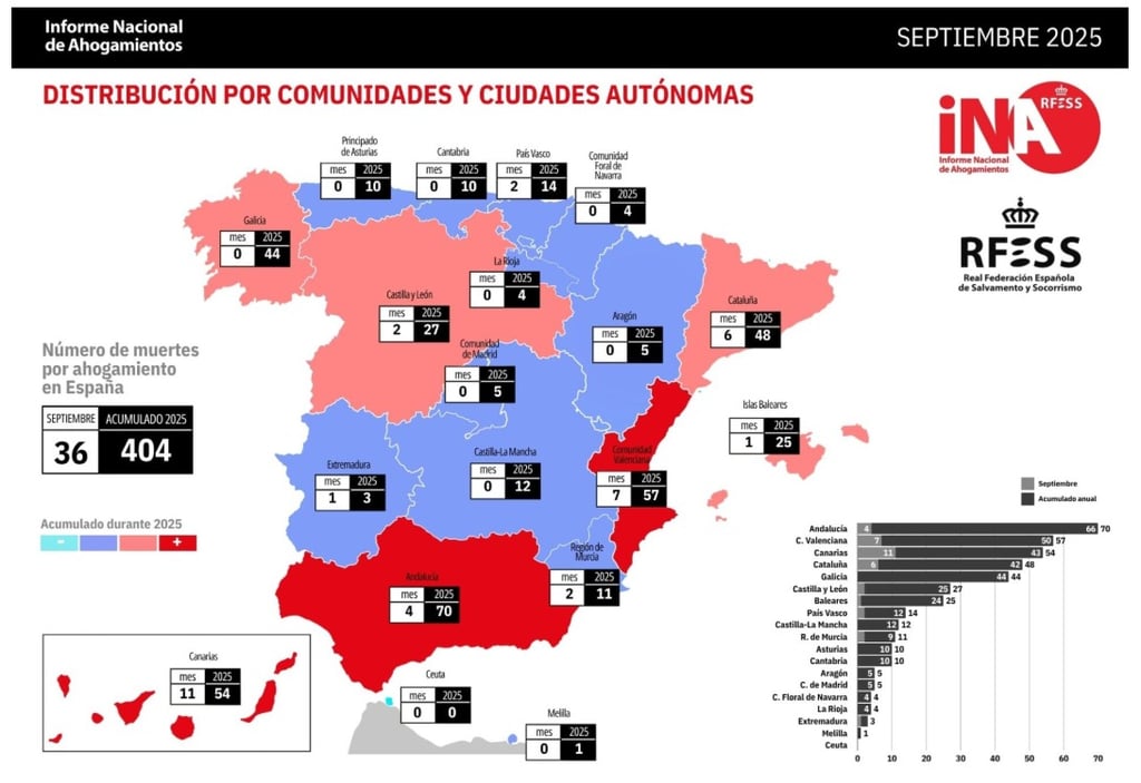 El mes de septiembre ha dejado 36 muertes por ahogamiento no intencional en los espacios acuáticos españoles, lo que eleva a 404 el total de fallecidos en lo que va de 2025. Este dato convierte el actual ejercicio en el segundo peor de la serie histórica a estas alturas del año, únicamente superado por 2024.