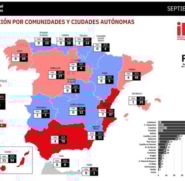 Por comunidades autónomas, Andalucía encabeza el acumulado anual con 70 fallecidos, seguida de la Comunidad Valenciana con 57 y Canarias con 54. La comunidad insular de Canarias, además, ha sido la más afectada durante septiembre, con 11 muertes, por delante de Comunidad Valenciana con 7 y Cataluña con 6.